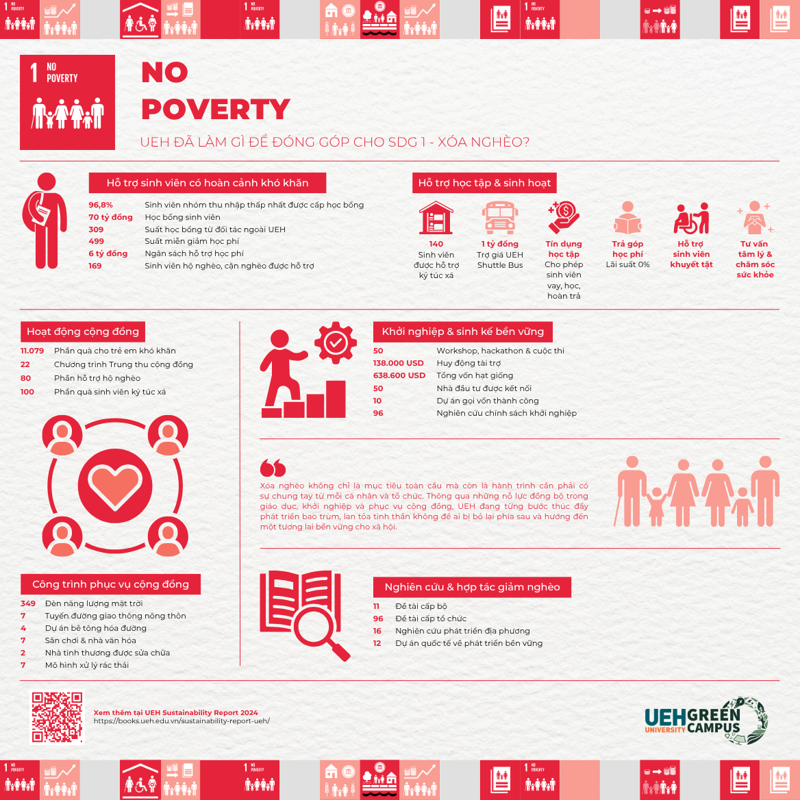 Hướng đến hiện thực hóa SDG 1, UEH đã triển khai nhiều chính sách hỗ trợ sinh viên có hoàn cảnh khó khăn nhằm đảm bảo cơ hội tiếp cận giáo dục công bằng. Cụ thể, UEH đã tuyển sinh toàn diện các nhóm dễ bị tổn thương, phân bổ 70 tỷ đồng học bổng và cấp 309 suất học bổng từ các đơn vị ngoài UEH, triển khai tín dụng học tập linh hoạt và hỗ trợ việc trả góp học phí với lãi suất 0%. Năm 2024, 499 suất miễn giảm học phí với ngân sách gần 6 tỷ đồng được ban hành, hỗ trợ ký túc xá cho hơn 140 sinh viên cùng các dịch vụ trợ giá xe buýt, chăm sóc sức khỏe thể chất - tinh thần và hỗ trợ sinh viên khuyết tật. Những nỗ lực này đã giúp cho 96,8% sinh viên thuộc nhóm 20% thu nhập thấp nhất được cấp học bổng, đồng thời hỗ trợ trực tiếp cho 169 sinh viên hộ nghèo, cận nghèo.