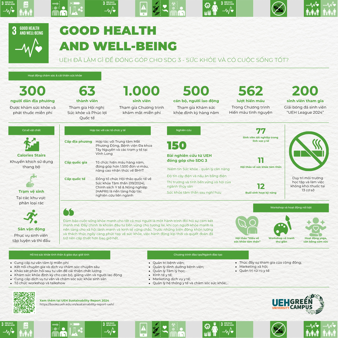 Đồng hành cùng SDG 3, UEH đã triển khai đa dạng các chương trình chăm sóc sức khỏe cho cộng đồng và người học. Cụ thể, gần 300 người dân được khám chữa bệnh tình nguyện, gần 1.000 người học được khám mắt miễn phí, các cán bộ và nhân viên của UEH được tham gia khám sức khỏe định kỳ. Ngoài ra, các hoạt động hiến máu tình nguyện, thể thao sinh viên hay đầu tư đồng bộ cơ sở vật chất như UEH Green Campus - Calories Stairs, trạm vệ sinh tại khu vực phân loại rác, sân vận động đã góp phần thúc đẩy lối sống lành mạnh, khuyến khích vận động và nâng cao sức khỏe cho toàn trường.