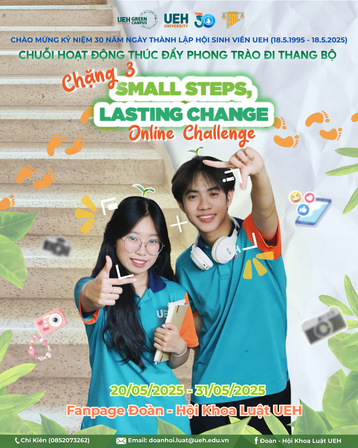 Kết hợp giữa thử thách thể chất và chiến dịch nâng cao nhận thức về môi trường, chặng 3 “Small steps – Lasting change” diễn ra trong 7 ngày, kêu gọi sinh viên ghi lại quá trình di chuyển bằng thang bộ trên ứng dụng đo bậc thang và quay video minh chứng đăng tải lên mạng xã hội kèm hashtag để lan tỏa thông điệp sống xanh. Với sự đồng hành của Đại sứ Truyền thông là các giảng viên, sinh viên UEH, thử thách đã nhận được sự hưởng ứng nồng nhiệt và nhiều video dự thi chất lượng. 3 sinh viên có lượt tương tác cao nhất trên trang cá nhân sẽ nhận được phần quà là một bộ dụng cụ thân thiện với môi trường do BTC chuẩn bị.