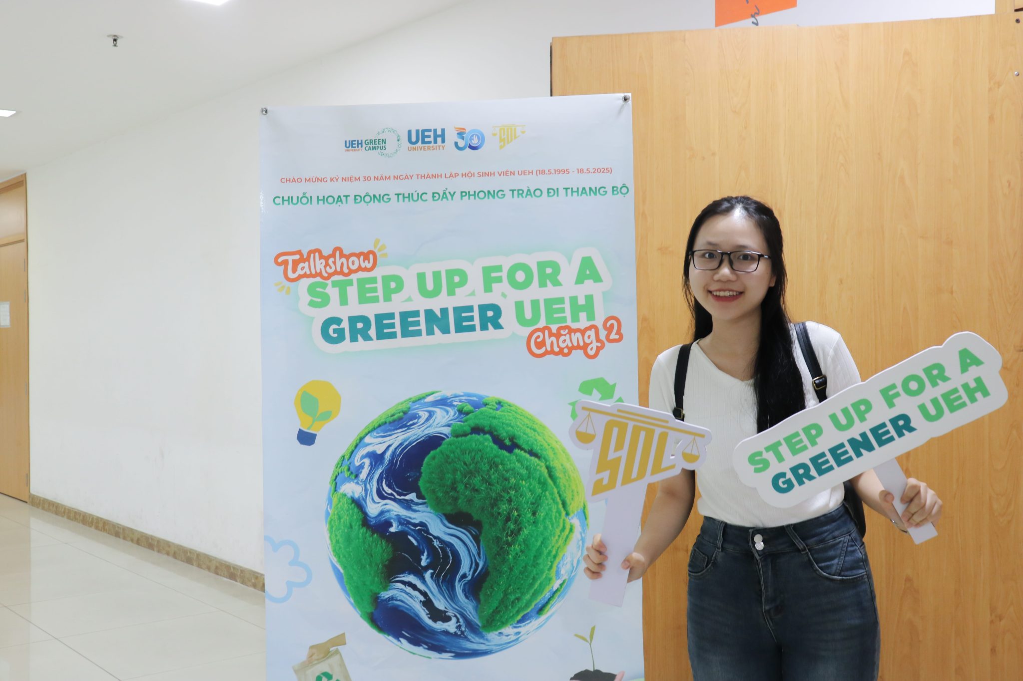 Tiếp nối thành công của chặng 1, Talkshow “Step up for a greener UEH” ở chặng 2 ghi dấu ấn với thông điệp về tầm quan trọng của Ngày Trái Đất, được truyền tải bằng hình ảnh, video clip trực quan và các hoạt động tương tác giúp sinh viên trang bị kiến thức về biến đổi khí hậu, khơi gợi ý thức trách nhiệm, tạo động lực cho mỗi cá nhân thay đổi từ những hành động nhỏ.