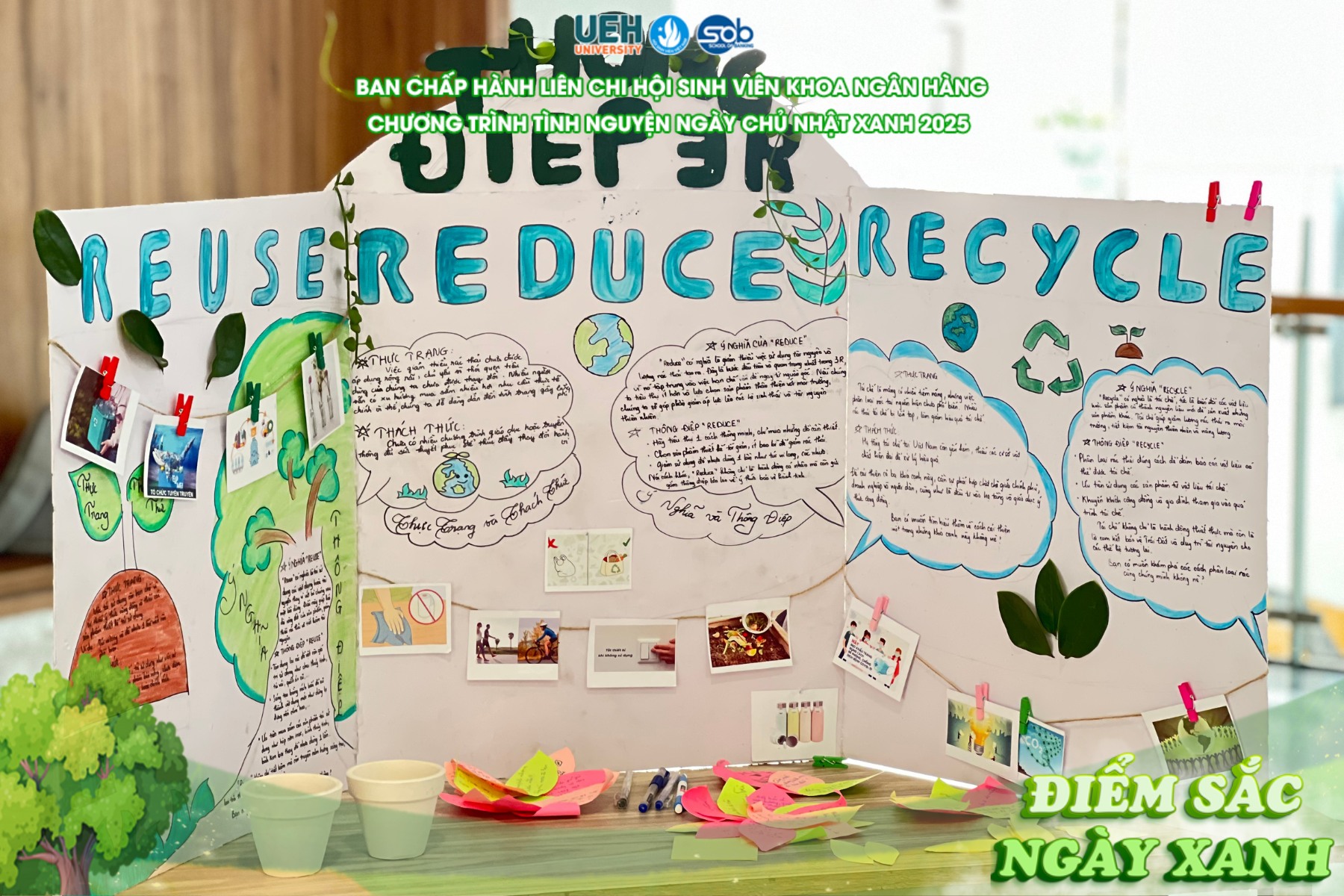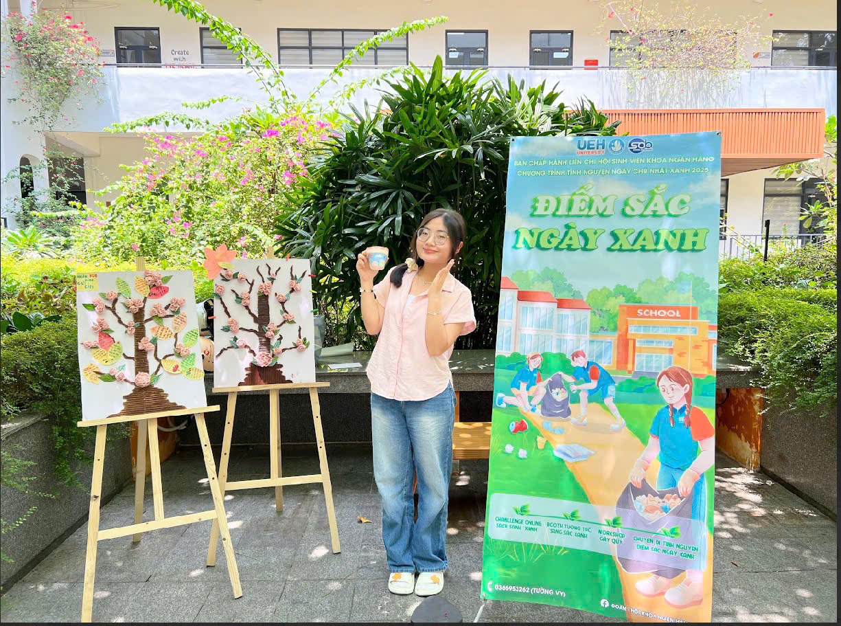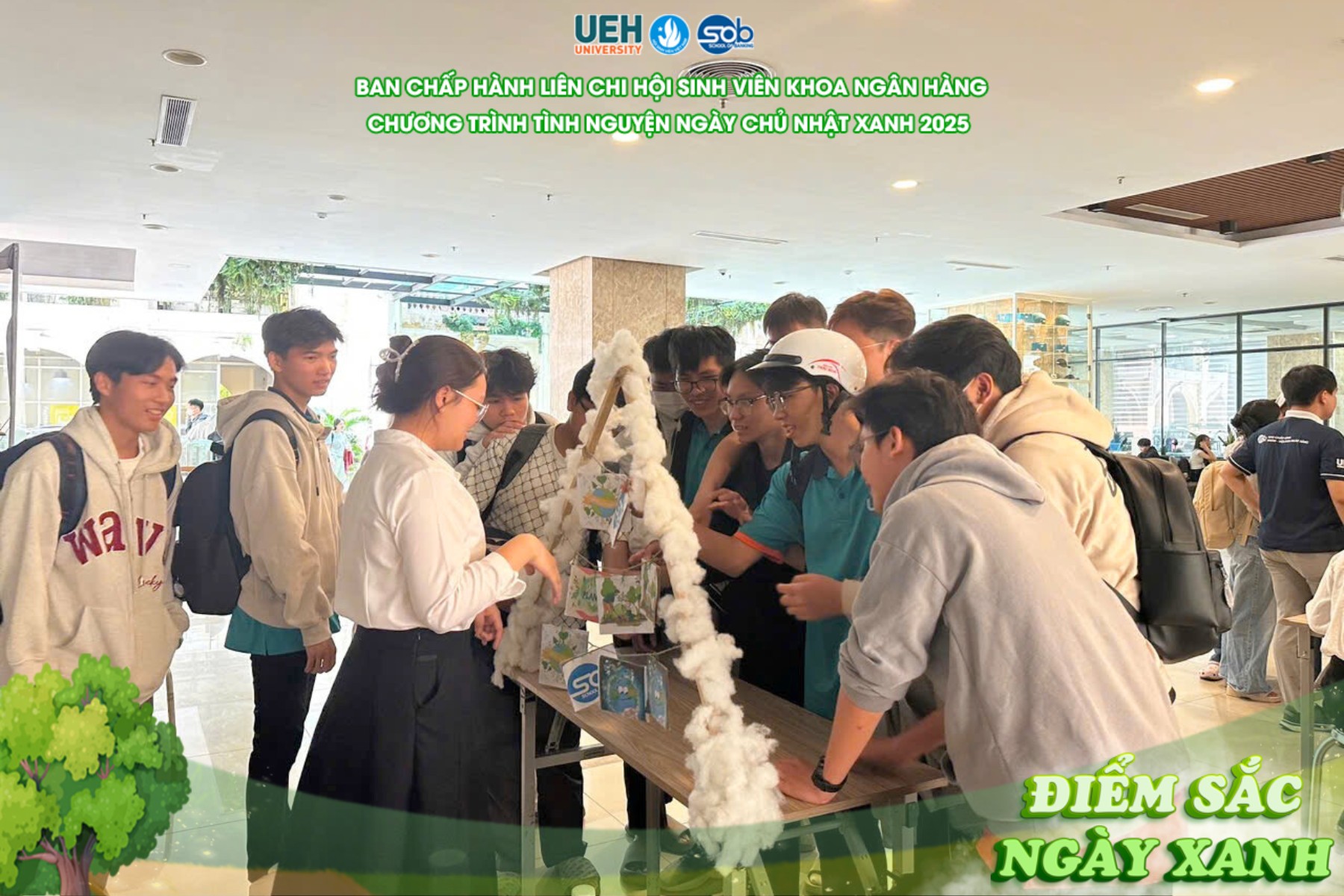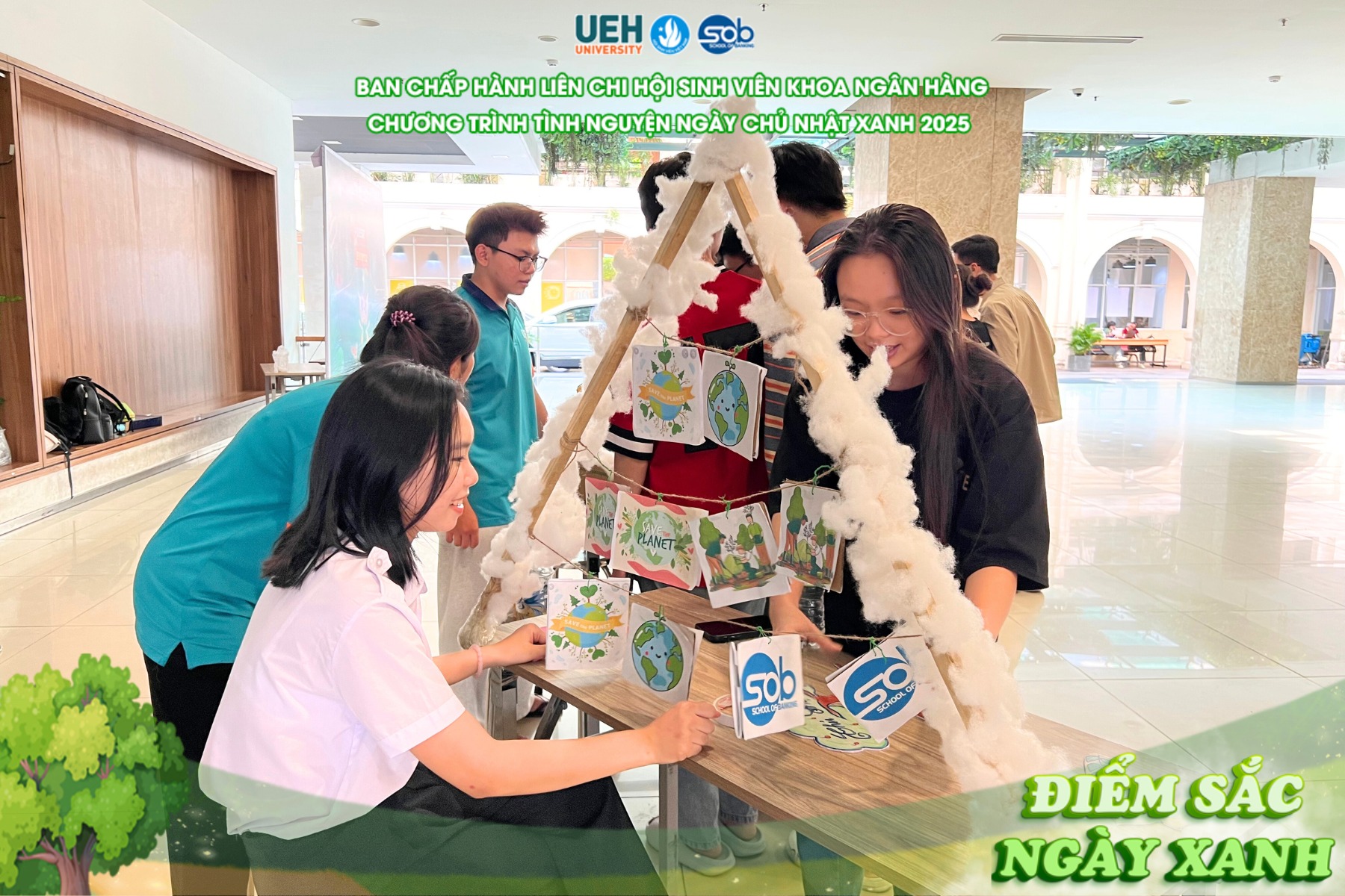 Nhằm thúc đẩy tinh thần xung kích, tình nguyện vì một môi trường xanh - sạch - đẹp và lan tỏa ý thức bảo vệ môi trường bền vững đến sinh viên Khoa Ngân hàng nói riêng và cộng đồng UEH nói chung, Chương trình "Điểm Sắc Ngày Xanh" đã được triển khai sôi nổi từ ngày 15/03 đến 31/03/2025. Bằng chuỗi hoạt động phong phú, từ những thử thách online “Sạch xành Xanh” thu hút hơn 1000 sinh viên tham gia, các booth tương tác sinh động về thông điệp 3R, Workshop Trang trí chậu cây đầy sáng tạo, đến chuyến đi tình nguyện thực tế tại xã Hiệp Phước (dọn dẹp cảnh quan, trang trí sân trường). Chương trình đã chứng minh rằng bảo vệ môi trường có thể bắt đầu từ những hành động nhỏ nhất, đồng thời tạo cầu nối để sinh viên thêm gắn kết với thiên nhiên và cộng đồng, nuôi dưỡng ý thức xây dựng một tương lai xanh, bền vững.