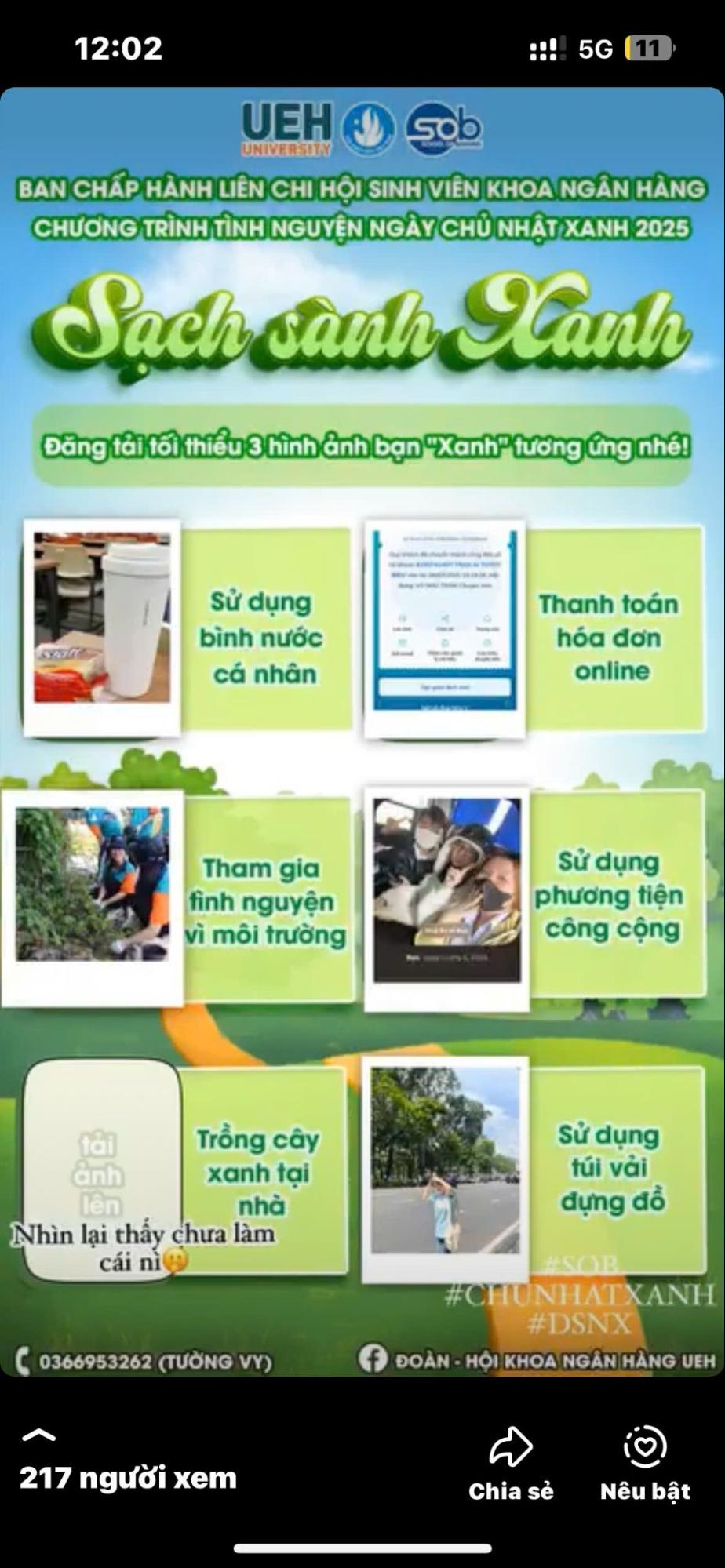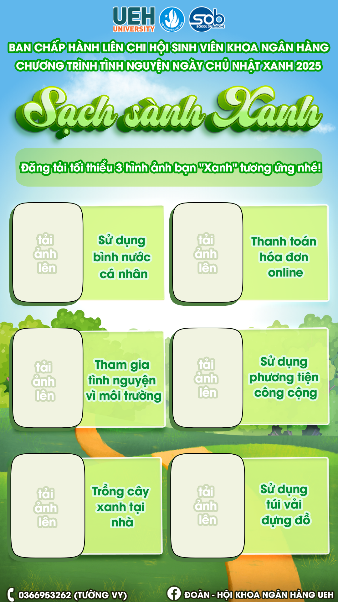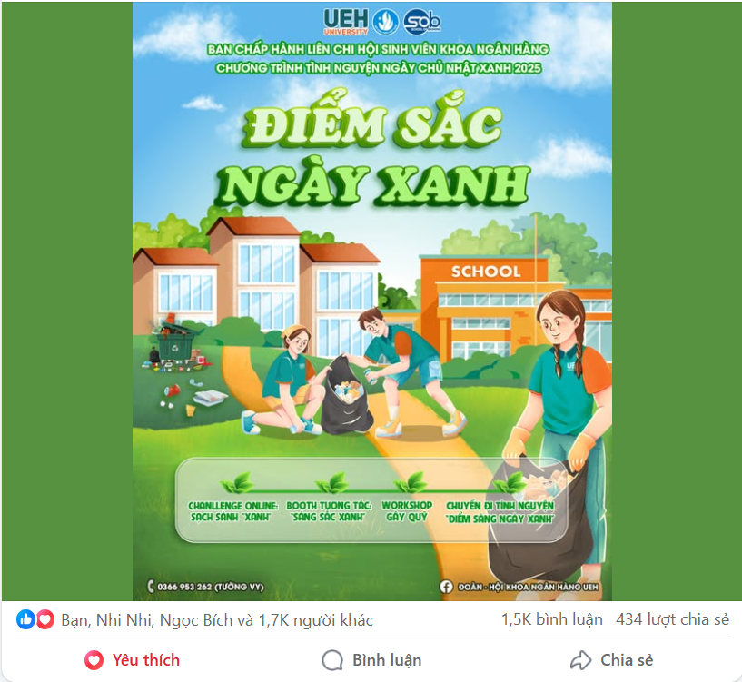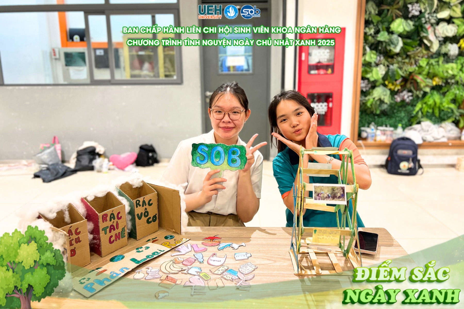 Nhằm thúc đẩy tinh thần xung kích, tình nguyện vì một môi trường xanh - sạch - đẹp và lan tỏa ý thức bảo vệ môi trường bền vững đến sinh viên Khoa Ngân hàng nói riêng và cộng đồng UEH nói chung, Chương trình "Điểm Sắc Ngày Xanh" đã được triển khai sôi nổi từ ngày 15/03 đến 31/03/2025. Bằng chuỗi hoạt động phong phú, từ những thử thách online “Sạch xành Xanh” thu hút hơn 1000 sinh viên tham gia, các booth tương tác sinh động về thông điệp 3R, Workshop Trang trí chậu cây đầy sáng tạo, đến chuyến đi tình nguyện thực tế tại xã Hiệp Phước (dọn dẹp cảnh quan, trang trí sân trường). Chương trình đã chứng minh rằng bảo vệ môi trường có thể bắt đầu từ những hành động nhỏ nhất, đồng thời tạo cầu nối để sinh viên thêm gắn kết với thiên nhiên và cộng đồng, nuôi dưỡng ý thức xây dựng một tương lai xanh, bền vững.