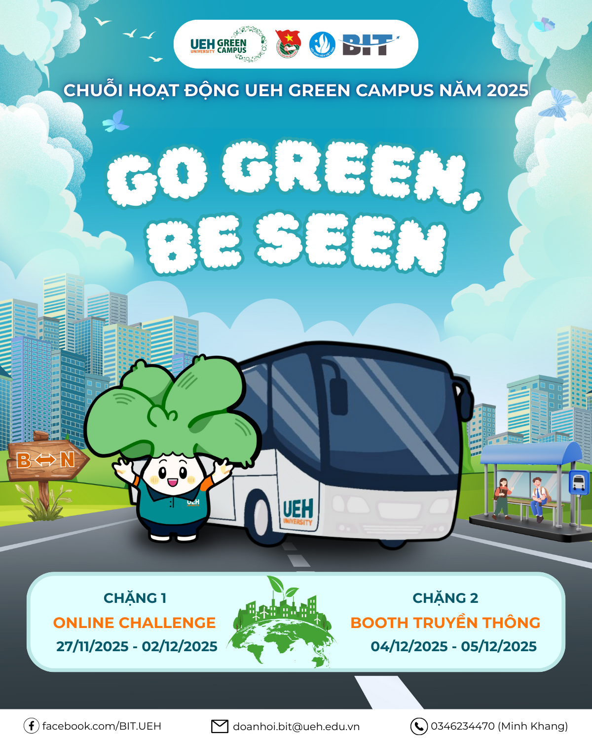 Chuỗi hoạt động “Go Green, Be Seen” đã thành công trong việc góp phần thúc đẩy lối sống xanh và tinh thần trách nhiệm cộng đồng. Qua các thử thách “Green Ride 5-Day Challenge” và các trạm trải nghiệm tại Booth truyền thông, sinh viên UEH đã được trực tiếp quan sát, so sánh, đánh giá và lựa chọn những phương tiện di chuyển thân thiện với môi trường, đồng thời nhận thức rõ mối quan hệ giữa thói quen cá nhân và tác động chung đến cộng đồng và môi trường. Đoàn - Hội khoa Công nghệ thông tin kinh doanh gửi lời cảm ơn sâu sắc tới toàn thể sinh viên đã góp phần làm nên thành công của chuỗi hoạt động. Hy vọng rằng những thói quen xanh mà mỗi sinh viên nuôi dưỡng hôm nay sẽ tiếp tục lan tỏa mạnh mẽ và trở thành động lực cho một UEH xanh hơn trong tương lai.