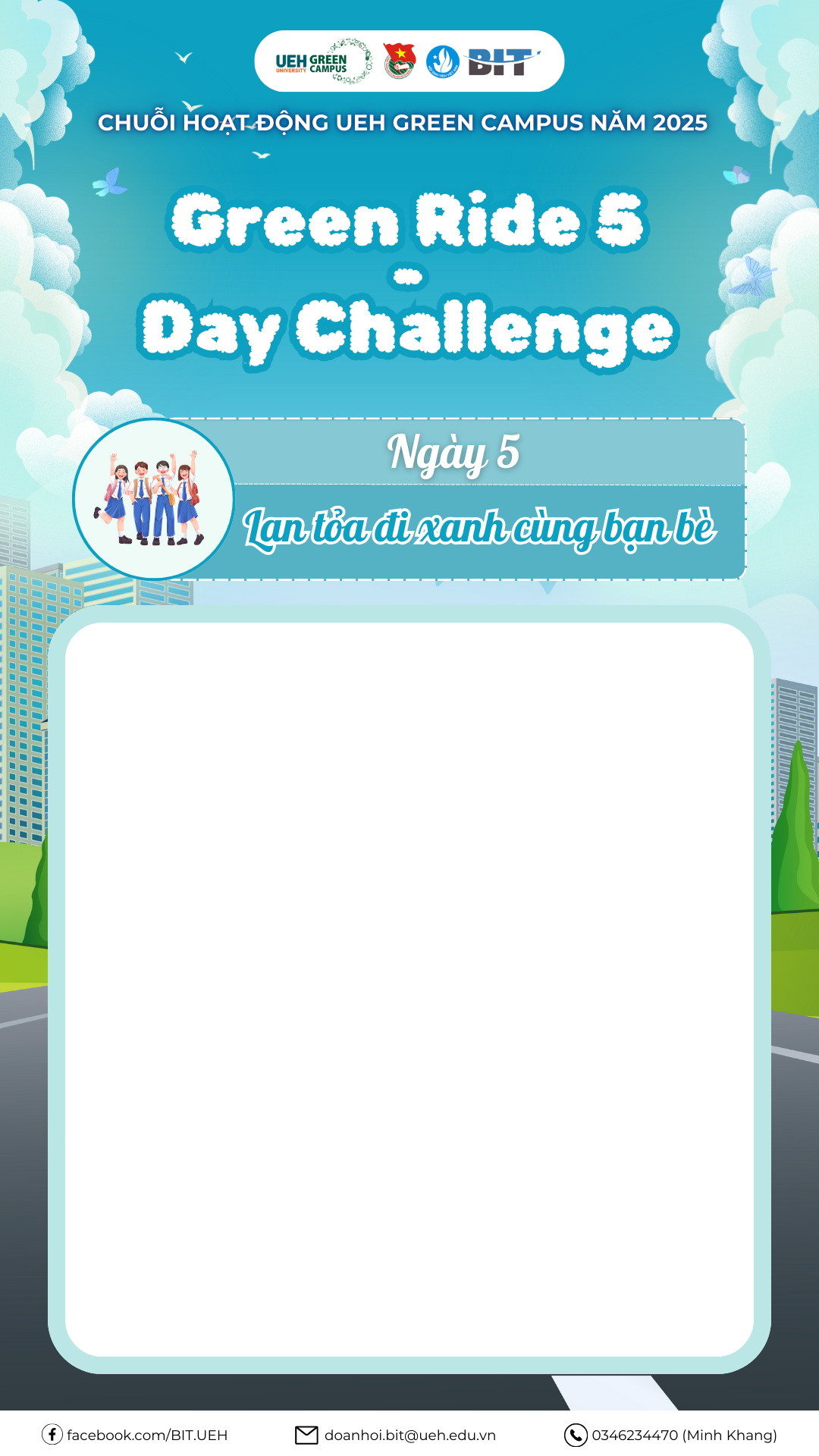 Sinh viên tham gia thử thách 5 ngày đi xanh liên tiếp qua các hoạt động: Ngày không xe máy, Trải nghiệm phương tiện công cộng, Quãng đường ngắn đi xanh, Lập lộ trình xanh thông minh bằng các ứng dụng giao thông, Lan tỏa đi xanh cùng bạn bè. Các bạn sinh viên đăng tải hình ảnh và chia sẻ trải nghiệm trên nền tảng Facebook/Instagram, góp phần lan tỏa tinh thần di chuyển xanh đến toàn trường.