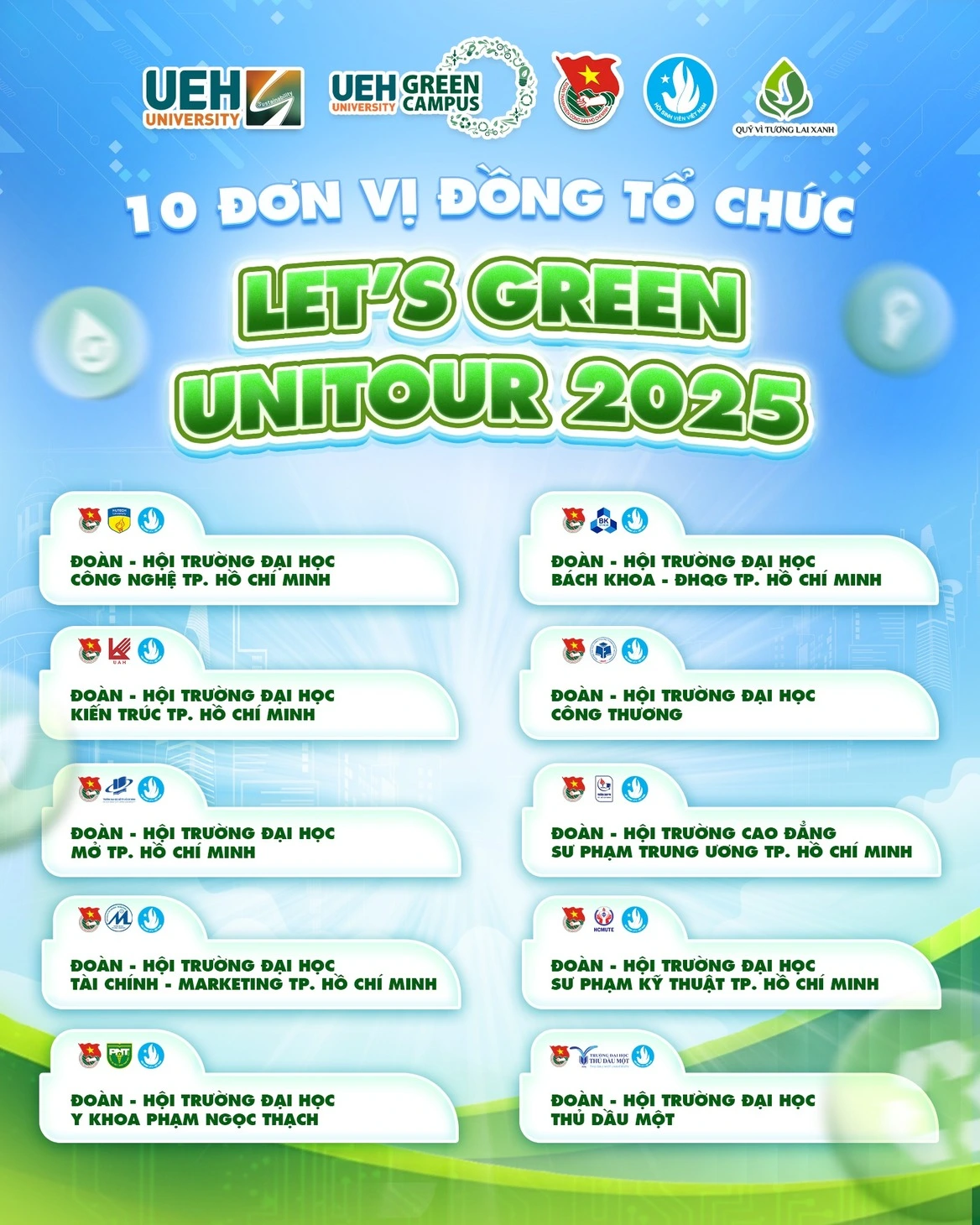 Let’s Green Unitour là một sản phẩm thuộc Dự án UEH Green Campus và là một phần trong chiến dịch Học kỳ Xanh - Kiến tạo cộng đồng Xanh của Quỹ Vì tương lai xanh thuộc Tập đoàn Vingroup. Được thực hiện bởi Ban đề án Đại học Bền vững, Dự án UEH Green Campus và Đoàn Thanh niên - Hội sinh viên UEH, Let’s Green Unitour đặt mục tiêu tạo không gian trải nghiệm Hệ sinh thái Đại học xanh UEH, nâng cao nhận thức môi trường cho sinh viên, lan tỏa Mô hình Đại học xanh UEH đến cộng đồng và xây dựng Mạng lưới Đại học Xanh tại Việt Nam.
