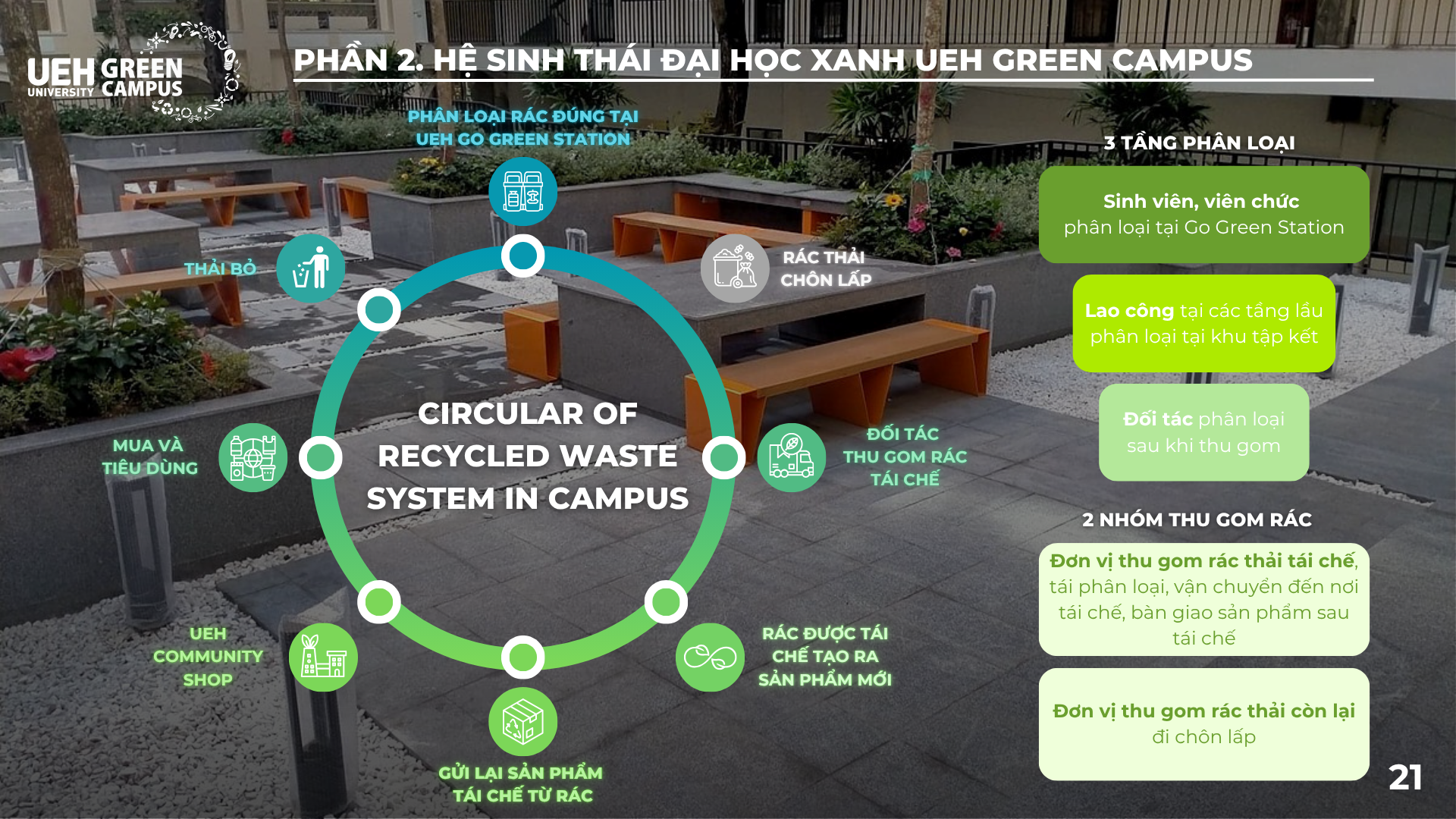 “Hệ thống tuần hoàn rác thải tái chế khép kín tại UEH” - Circular of Recycled waste System in campus là sản phẩm của Living Lab UEH Green Campus gồm giải pháp “3 tầng phân loại” và “2 nhóm thu gom" nhằm giúp Rác tái chế được phân loại hiệu quả tại nguồn; Rác sau khi phân loại được đối tác thu gom mang đến nhà máy tái chế; Sản phẩm được tái chế từ rác gửi về trường.