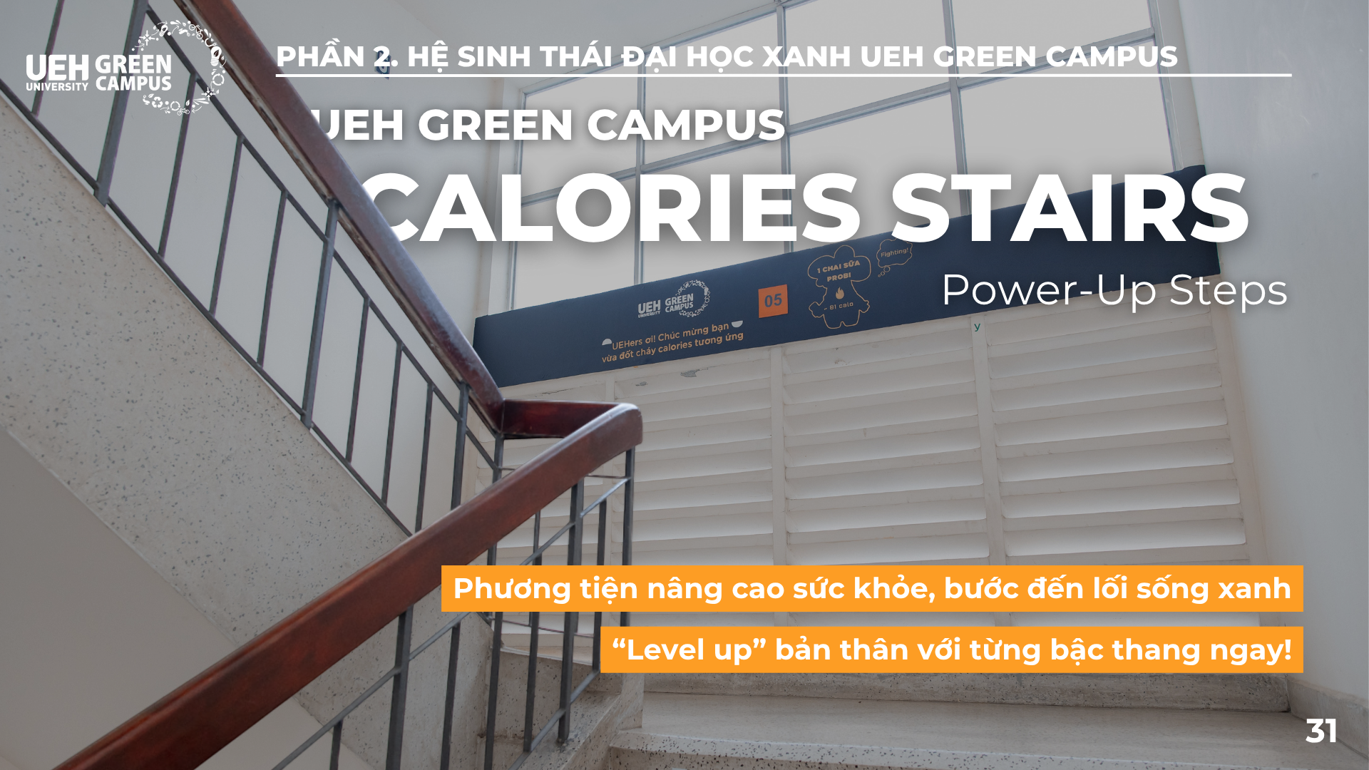 Là một sản phẩm thuộc dự án UEH Green Campus. Không chỉ đơn thuần là những bậc cầu thang được khoác lên một màu áo mới cùng với các thông điệp khuyến khích cộng đồng UEHers sử dụng thang bộ để nâng cao sức khỏe, Calories Stairs còn chính là phương tiện để chúng ta từng bước đến gần hơn với lối sống xanh, tiết kiệm năng lượng và giảm phát thải từ việc sử dụng thang máy.