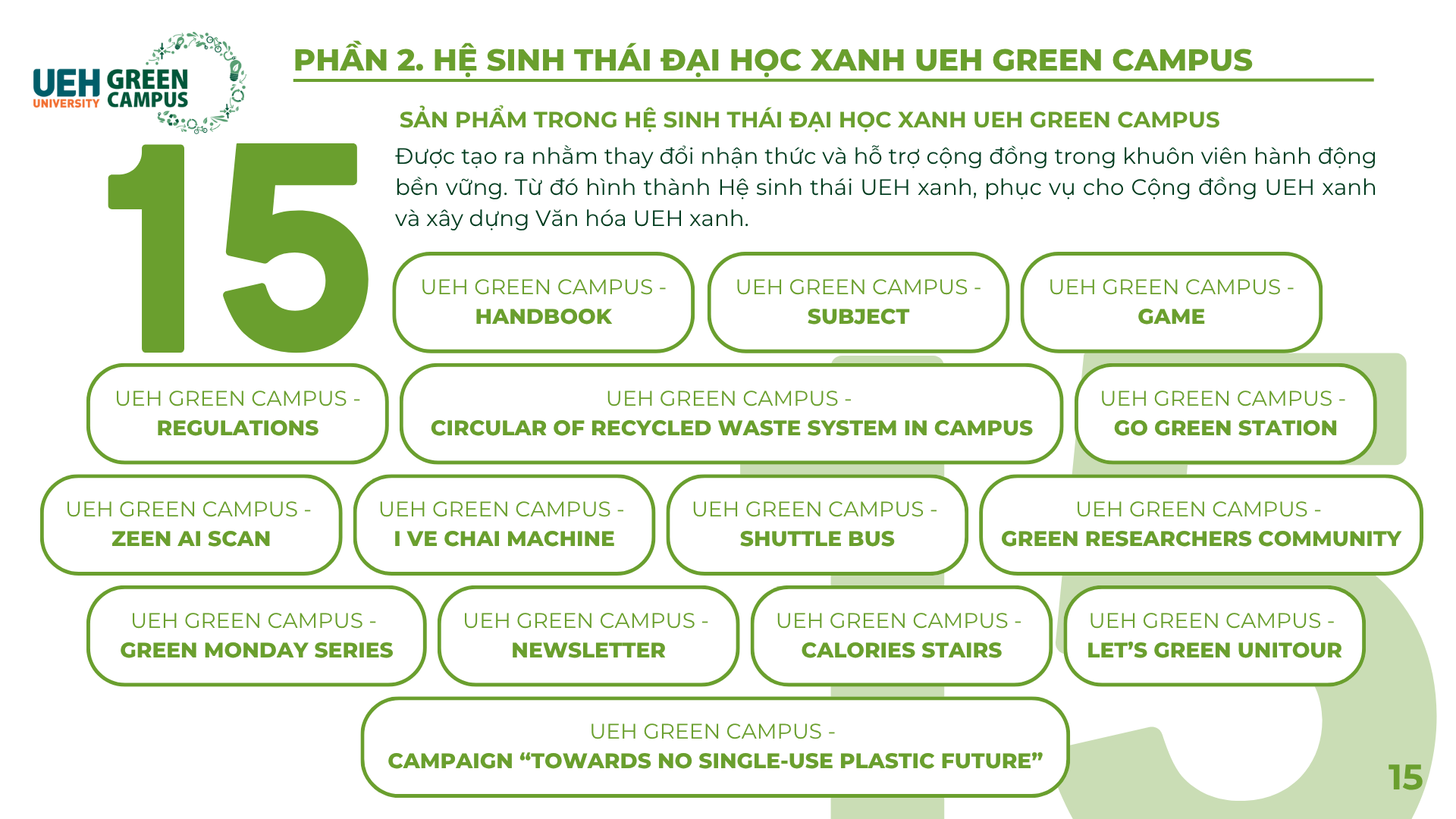 Từ lý thuyết đến hành động, từ ý tưởng đến hệ sinh thái xanh sống động, Dự án UEH Green Campus đã và đang từng bước kiến tạo một khuôn viên đại học phát triển bền vững giữa lòng đô thị. Với định hướng vận hành theo mô hình Living Lab – “Phòng thí nghiệm sống”, dự án không chỉ giúp thay đổi hành vi của cộng đồng UEHers mà còn truyền cảm hứng mạnh mẽ cho các trường đại học và tổ chức khác cùng hành động vì tương lai xanh. Hệ sinh thái gồm 15 sản phẩm tiêu biểu sau đây là minh chứng rõ nét cho hành trình đổi mới sáng tạo, lan toả tư duy xanh và cam kết thực thi các Mục tiêu Phát triển Bền vững (SDGs) ngay từ chính khuôn viên trường học.