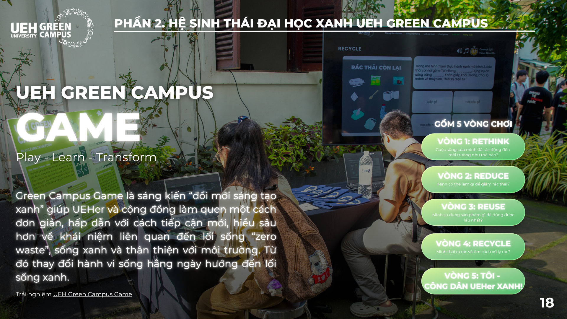 Là nền tảng ứng dụng công nghệ giả lập game (gamification) trong thay đổi nhận thức và hành vi sống xanh “Play.Learn.Transform", được phát triển bởi Ban đề án Đại học Bền vững và Viện Đô thị thông minh và quản lý, ứng dụng khéo léo cơ chế của trò chơi vào hoạt động giáo dục, đào tạo kiến thức giúp thay đổi nhận thức, hành động về môi trường, làm gia tăng tính thu hút, sự hấp dẫn và tương tác với những người tham gia.
