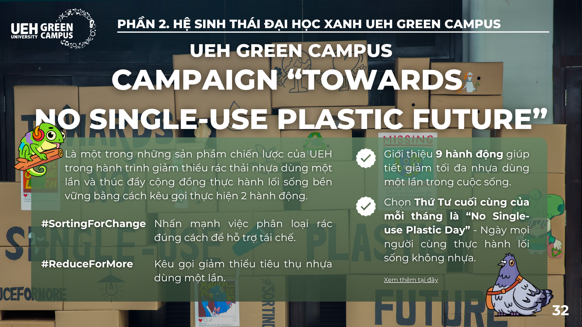 Là một trong những sản phẩm chiến lược của UEH trong hành trình giảm thiểu rác thải nhựa dùng một lần và thúc đẩy cộng đồng thực hành lối sống bền vững bằng cách kêu gọi thực hiện 2 hành động chính #SortingForChange – nhấn mạnh việc phân loại rác đúng cách để hỗ trợ tái chế, và #ReduceForMore – kêu gọi giảm thiểu tiêu thụ nhựa dùng một lần. Đồng thời, giới thiệu đến cộng đồng 9 hành động giúp tiết giảm tối đa nhựa dùng một lần trong cuộc sống như mang theo vật dụng cá nhân, nói không với bao bì nhựa dùng một lần,... Ngoài ra, UEH đã chọn thứ Tư cuối cùng của mỗi tháng là "No Single-use Plastic Day", là ngày mọi người người thực hành lối sống không nhựa dùng một lần một cách triệt để và hiệu quả.