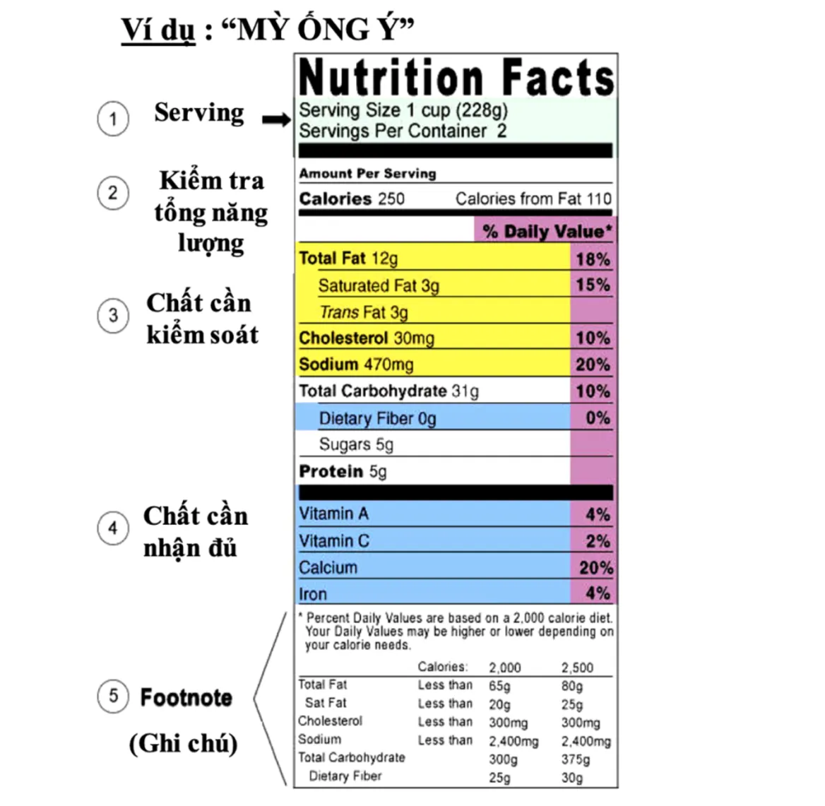 Bước 3: So sánh %DV (Daily Value) - giữ dưới 5% cho thực phẩm lành mạnh; %DV từ 5% trở xuống là thấp, trên 20% là cao.