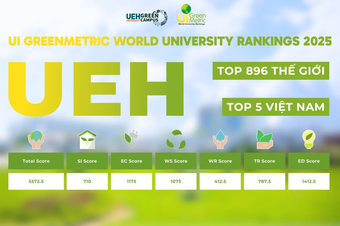 Năm 2025, Đại học Kinh tế Thành phố Hồ Chí Minh (UEH) tiếp tục ghi dấu ấn tích cực trên Bảng xếp hạng UI GreenMetric World University Rankings, với kết quả tăng hạng rõ rệt cả ở quy mô quốc gia và quốc tế, khẳng định những nỗ lực bền bỉ trong chiến lược xây dựng đại học xanh, bền vững và có trách nhiệm xã hội.
