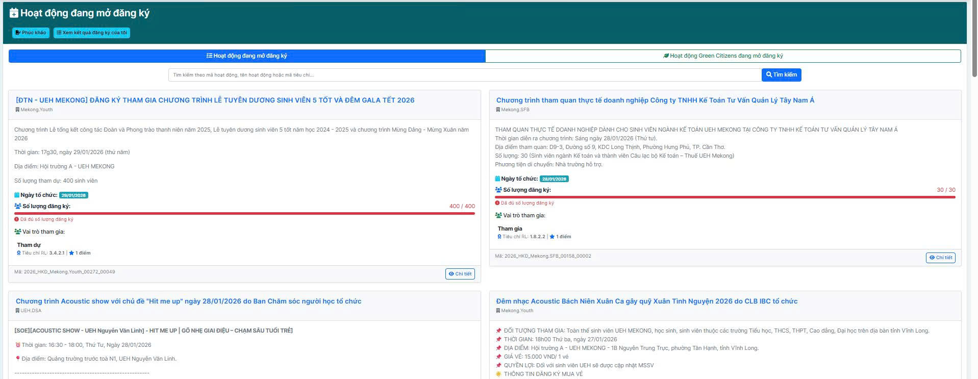 Sinh viên tham gia các chương trình, chiến dịch, hoạt động cộng đồng, dự án hoặc CLB về môi trường và phát triển bền vững do UEH tổ chức hoặc phối hợp triển khai.