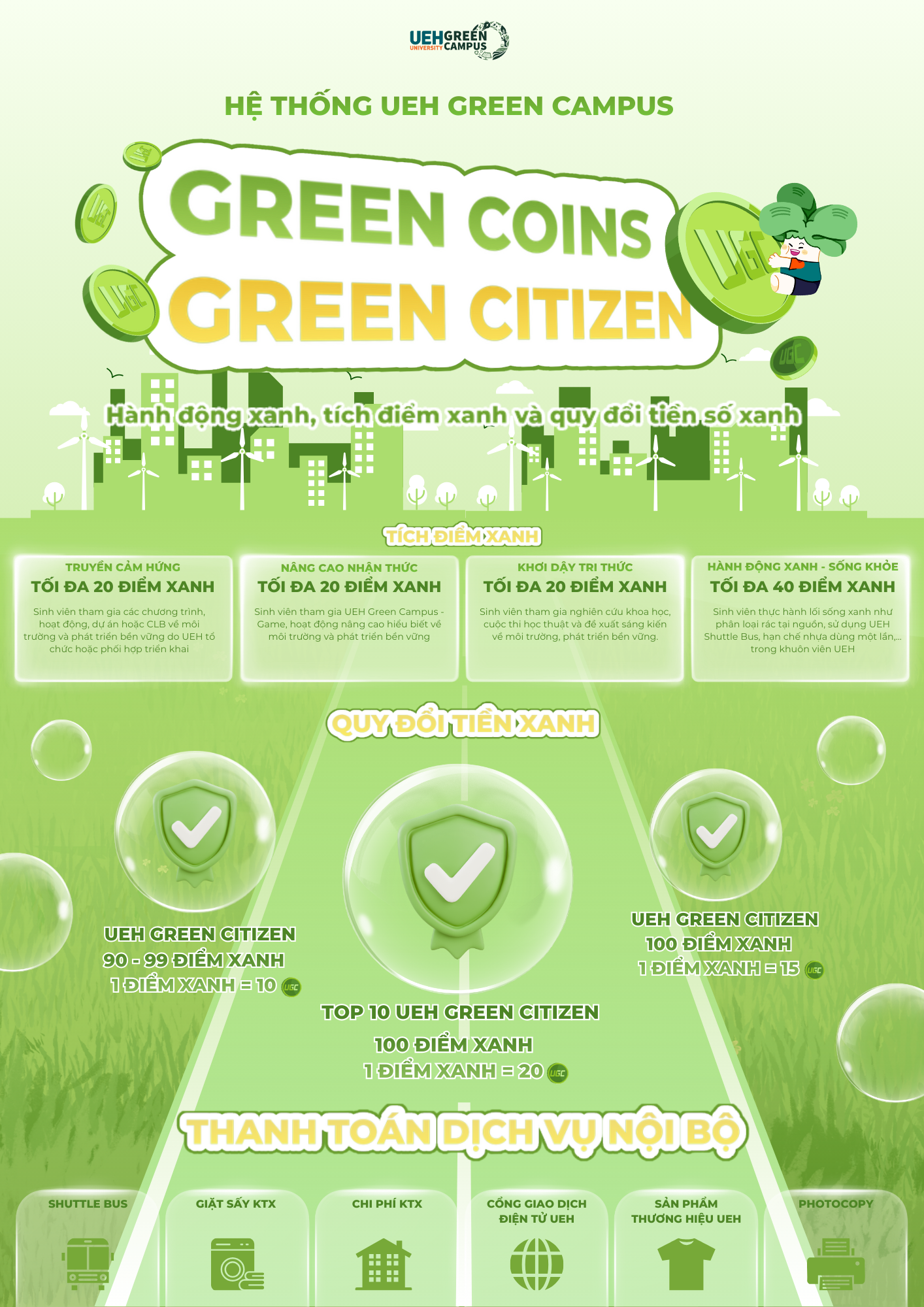 - Bước 3: Sinh viên đạt danh hiệu Công dân Xanh UEH có thể quy đổi điểm sang tiền số Green Coins để thanh toán hoặc giảm trừ dịch vụ nội bộ tại UEH. Các dịch vụ dự kiến bao gồm UEH Shuttle Bus, dịch vụ giặt sấy tại KTX, photocopy, thanh toán chi phí KTX, mua bán sản phẩm thương hiệu UEH và các dịch vụ hành chính tại Cổng giao dịch điện tử UEH